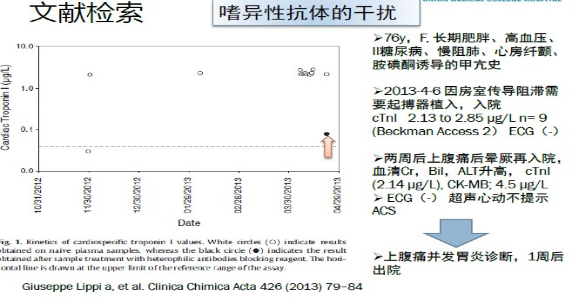 类风湿因子是针对免疫球蛋白G的自身抗体,其对肌钙蛋白测定的影响类似于嗜异性抗体,可以导致肌钙蛋白的假阳性升高。据报道约1%肌钙蛋白升高的患者是单纯地由于类风湿因子升高导致的。上面第二个病例因患者无动物及疫苗接触史,因此排除了嗜异性抗体的影响,而考虑类风湿因子对肌钙蛋白测定的影响。