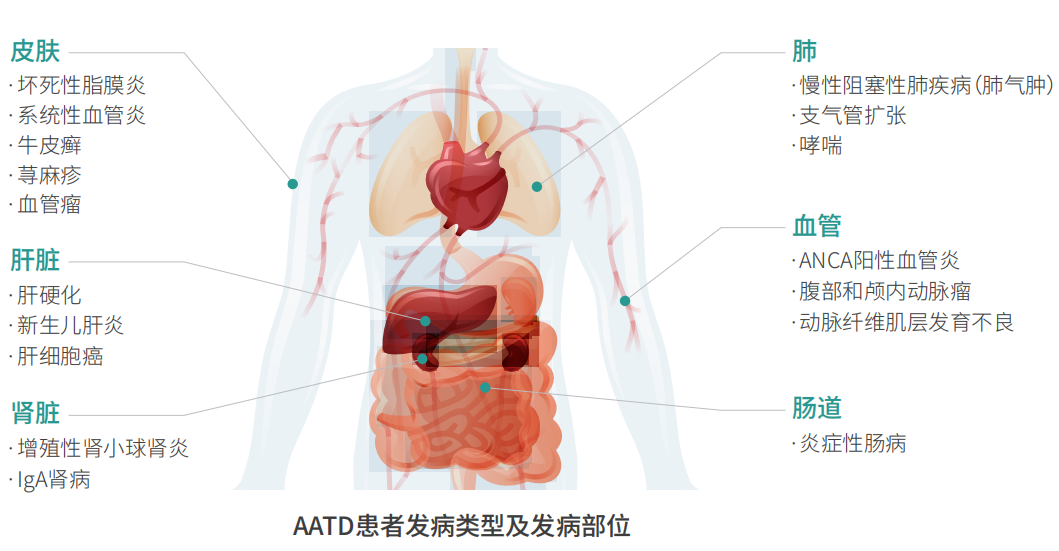 儿童发病(新生儿黄疸)约占10%,成人AATD发展为肝硬化的约占15%。基因突变导致α1-AT蛋白结构错误折叠与和分泌障碍(无法进入血液循环),α1-AT丧失正常生理功能,无功能的α1-AT间产生聚合反应,并在肝脏内积聚,不能拮抗内源和外源性蛋白酶对肝细胞的损伤,引发肝纤维化或肝硬化,严重者最终发展为肝衰竭(15%)。α1-抗胰蛋白酶缺乏症(AATD)还可能与其它一系列临床疾病相关,如自身免疫性肝炎、胆结石、继发性膜增生性肾小球肾炎、原发性硬化性胆管炎、脂膜炎、盆腔器官脱垂等。