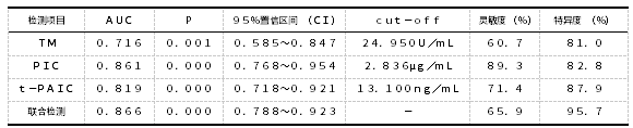 TM 和t-PAIC水平的升高可以反映早期DIC发生时内皮细胞的损伤情况,而PIC水平显著升高可以提示机体的纤溶系统被激活,采用TM、PIC和t-PAIC联合检测,其特异度可以达到95.7%,可以作为较好的DIC诊断指标。