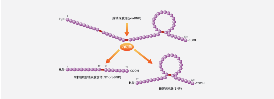 B型钠尿肽,又称脑利钠肽(Brain natriuretic peptide,BNP),是由心肌细胞合成的具有生物学活性的天然激素,主要在心室表达,同时也存在于脑组织中。心肌细胞受到压力/牵拉刺激后,即心室容积扩张、压力负荷增加时,首先形成一个含134个氨基酸的B型利钠肽原前体(pre-proBNP),随后蛋白酶切掉N端26个氨基酸的信号肽变成含有108个氨基酸的B型利钠肽原(proBNP),后者在内切酶作用下等摩尔地裂解为一个N端含有76个氨基酸的NT-proBNP,和一个环状结构含有32个氨基酸的BNP。两者主要由心室肌产生并分泌人血,心室肌无存储BNP/NT-proBNP的功能。心房肌也可产生一定量的BNP/NT-proBNP。